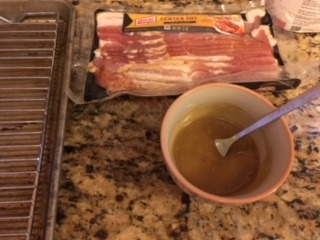 Paint the bacon, on one side, with the mustard/syrup mixture.