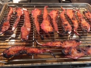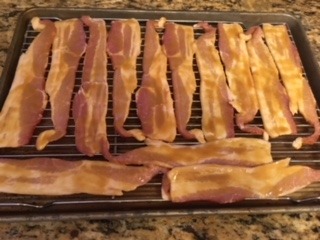 Bake in a preheated 375 degree oven until the bacon is nice and crisp, about 15 minutes. Turn the bacon over and cook another 15 minutes or so.