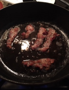 Cook the onions in the remaining bacon fat. If there’s more than 2-3 tablespoons of fat, remove it from the pan.