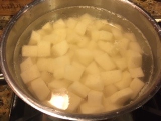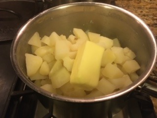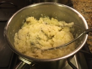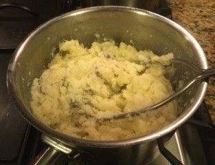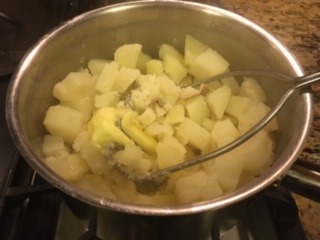 In a separate pot, mash the potatoes with a potato masher, add the butter, and just enough of the milk to make traditional mashed potatoes.