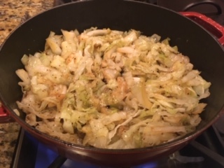 When the onions are cooked, add the cabbage and cook until the cabbage is soft.