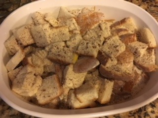 Mix the remaining casserole ingredients together and pour over the bread cubes pushing the cubes down to submerge them.