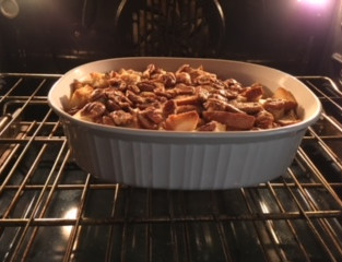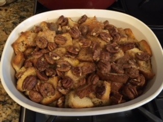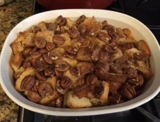 The next morning, mix together the pecan topping ingredients and smear over the casserole.