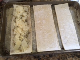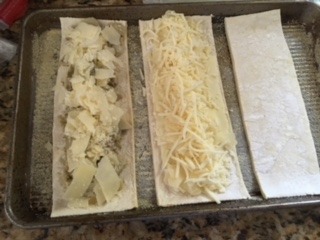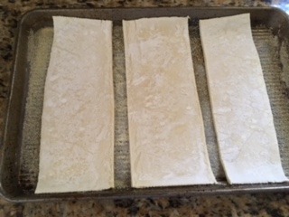 Cut the puff pastry into 3 even pieces. Lay the pieces on the greased and lightly cornmeal dusted baking sheet.