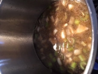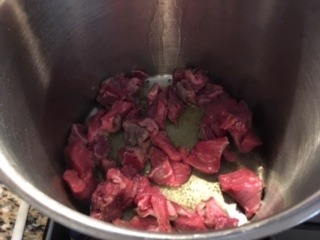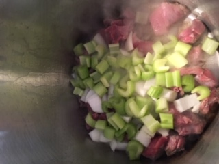 Add the oil to a large dutch oven or gumbo pot. Heat on medium and cook the onions and celery. Add the beef and sear.